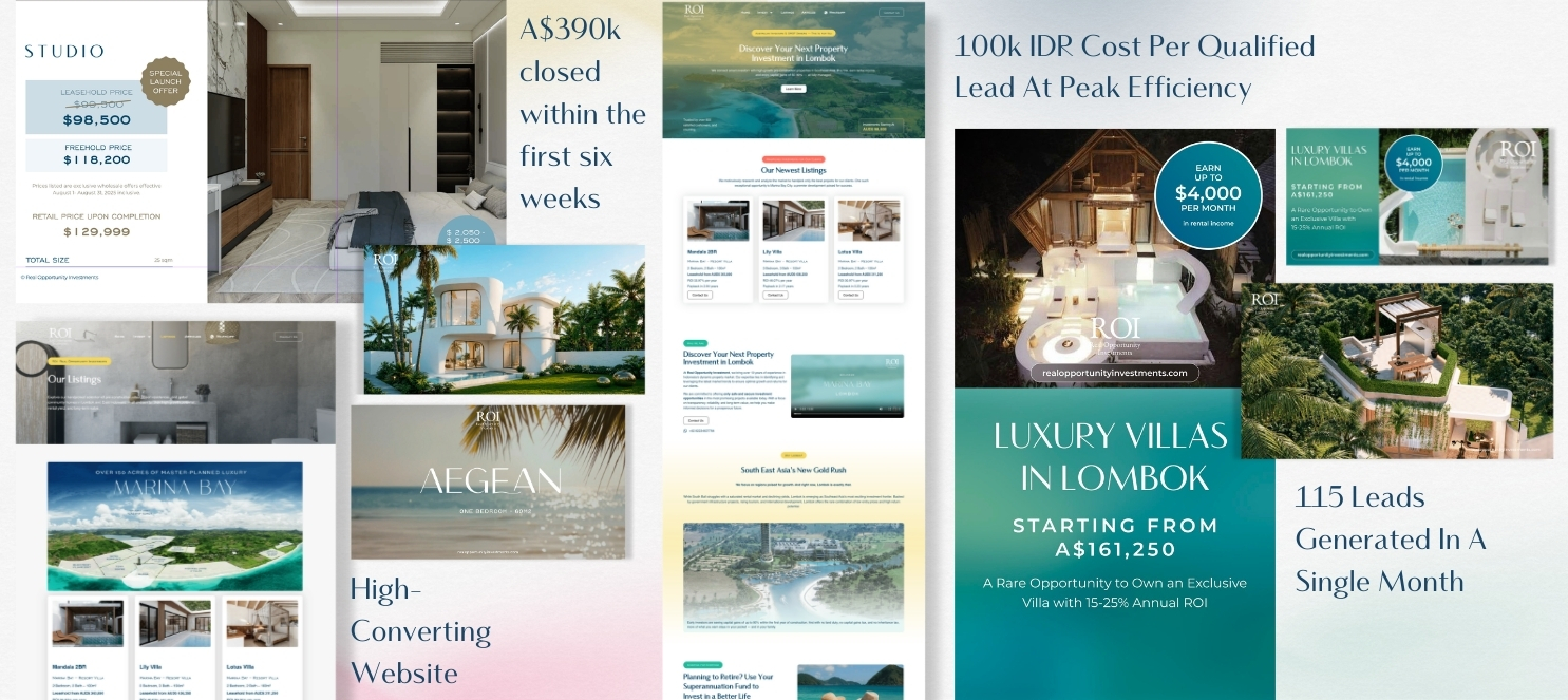 We launched and managed multi-tiered Meta and Google Ads campaigns covering top-of-funnel awareness, mid-funnel education around Lombok versus Bali, and bottom-funnel villa offers and investment opportunities.